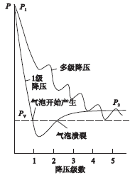 高壓液體流經節流孔時,閥座相當于節流孔板(圖4),靜壓能與動壓能相互轉換,流速的增加導致壓力降低。當壓力降低至等于或低于該液體在入口溫度下的汽化壓力PV時,液體中的氣核即膨脹而形成汽泡。流過節流面后,在寬敞的下游流道中流速下降,壓力回升。當壓力回升至P2時,并≥PV時,汽泡潰裂,這即是汽化過程。汽泡潰裂時,釋放出巨大的能量,對閥座、閥瓣等節流元件產生破壞即汽蝕。汽蝕的破壞力很大,一般的閥門在汽化條件下,運行一定時間后即遭受嚴重汽蝕,致使閥座泄漏量高達額定流量的30%以上,調節閥完全喪失調節控制功能。