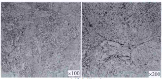 (1)該杠桿銷釘化學(xué)成分合格,金相組織粗大,可見(jiàn)黑色網(wǎng)狀?yuàn)W氏體晶界,粗晶2級(jí),硬度高,沖擊韌性低,金相組織、硬度、沖擊功均不滿足標(biāo)準(zhǔn)要求。