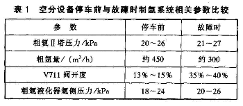 在結(jié)霜部位上方有以下液體閥門:手動(dòng)閥V702(粗氬冷凝器液氬回流閥)、手動(dòng)閥V704(粗氬冷凝器液空恒流閥)、氣動(dòng)調(diào)節(jié)閥V711(粗氬液化器液氮調(diào)節(jié)閥)、氣動(dòng)調(diào)節(jié)閥V706(精氬冷凝器液氮調(diào)節(jié)閥)和手動(dòng)閥V714(精氬冷凝器液氬回流閥)。根據(jù)施工圖紙確定冷箱西側(cè)結(jié)霜位置內(nèi)部管道布置稀少,所以判斷為上述幾個(gè)閥門或閥門前后管道出現(xiàn)了問題。此時(shí)有操作人員反映,此次投產(chǎn)空分設(shè)備時(shí)V711閥的開度要比停運(yùn)前大很多,相關(guān)參數(shù)比較見表1。
