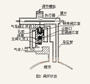 如圖1所示,當?shù)忾y關閉時,主閥的活塞是在一個密封室內(nèi),當儲罐壓力等于或大于設定的壓力時,膜片就被向上頂起,氣導閥在彈簧的作用下向上移動,把氣導閥上的密封圈緊緊壓在閥座上,關閉了控制氣的進口,同時特殊閥芯室的壓力增加并接近氮氣總管的壓力,此壓力通過內(nèi)部通道,從特殊閥芯室傳到主閥閥芯室。主閥的活塞就處于氮氣總管壓力的作用,由于主閥閥芯上、下所受氣體壓力平衡,所以主閥閥芯在自重和彈簧的作用下將閥門緊密關死。