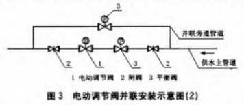 如圖2所示,將電動調節(jié)閥和平衡閥兩路并聯(lián),聯(lián)合調節(jié)是目前常用的既經濟又合理且方便使用的組合方式。該方法的調節(jié)方法和過程是這樣的:在供熱初期,將平衡閥一路關閉,打開電動調節(jié)閥一路,根據(jù)實際需要調節(jié)開度,隨著供熱規(guī)模的擴大,調節(jié)電動閥的開度以適應用熱的發(fā)展,直至達到最大合理開度仍無法滿足要求時,先關閉電動調節(jié)閥,將平衡閥一路開啟,根據(jù)需要調節(jié)平衡閥的開度,由于平衡閥的調節(jié)功能有限,如果無法滿足流量要求或精度要求,此時開啟電動調節(jié)閥,對兩路流量進行合理分配和調節(jié),即可達到需要的流量和精度要求。調節(jié)是個精細的工作,既需要操作人員的技術水平和經驗,又需要準確的供熱數(shù)據(jù)作為調節(jié)的基礎,因此要將此項工作做好,還需要做大量的準備和調節(jié)工作。