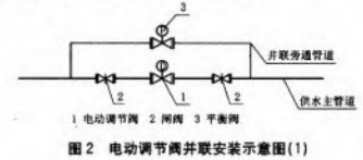 3)熱力站的初期供熱規(guī)模遠遠小于設計容量,且短期不能達到最終規(guī)模,1臺電動調節(jié)閥不能同時滿足初期和終期的供熱調節(jié)需求,這時可以有兩種辦法解決。方法一:先根據(jù)初期和中期的供熱負荷及運行參數(shù)計算出所需的流量,根據(jù)電動調節(jié)閥的選型原則進行選型,待熱負荷發(fā)展到超出該閥的調節(jié)范圍后,可另行選擇電動調節(jié)閥,此時以最終的供熱規(guī)模即設計容量為計算依據(jù),選取適用的電動調節(jié)閥。此方法費用相對較高,且實施起來較為煩瑣。方法二:用帶有調節(jié)功能的平衡閥與電動調節(jié)閥并聯(lián),各分擔一部分流量的調節(jié)功能(如圖2所示),這樣既可滿足初期的小流量調節(jié)要求,也可同時滿足終期的大流量調節(jié)要求,還能節(jié)約初投資,免去更換閥門的費用和精力。
