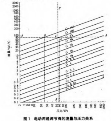 舉例如下。設計數(shù)據(jù):系統(tǒng)流量80m3/h,系統(tǒng)壓降55kPa,圖1為調節(jié)閥的流量與壓力關系圖,圖中水平線A-A表示流量為80m3/h,垂直線B-B表示壓降為55kPa。