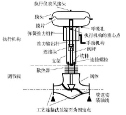 a)高溫(蒸汽介質)環境中,大多會出現填料泄漏故障,內件易損壞(閥芯閥座磨損失配、閥芯脫落),內部泄漏量大,不易控制,調節品質差,與工藝連接的法蘭端面很容易泄露等故障。圖1,圖2分別為普通調節閥和高溫型調節閥結構。從圖中可以看出,由于加了一截散熱器的距離,使用溫度越高散熱器就越長,因此,高溫型調節閥執行機構重心點距安裝軸線的距離,比普通型調節閥要長的多,非垂直安裝調節閥產生的力矩也要大得多。如:動力C鍋爐裝置的幾臺減溫減壓調節閥,合成氨裝置的調節閥等。