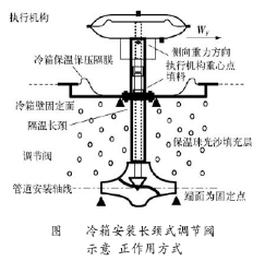 b)低溫(小于-100℃)深冷使用環境中,出現較多的也是填料泄漏故障。此類調節閥有較長的隔熱絕冷長頸,所處的環境溫差大,大多安裝使用在空分、液氮洗單元裝置上,它們基本上都有兩個支撐點,如圖3所示。管道和冷箱箱壁都是固定點,一端固定在管道、設備上,另一個就固定在保溫冷箱的邊壁上,閥體和長頸部分基本是固定死的,只有執行機構是側懸在冷箱壁之外的,如果執行機構太重并發生形變,受力點就在填料處,則填料處最易受力單邊磨損。空分、液氮洗(深冷)單元除箱頂安裝的調節閥以外,基本上都屬側裝和水平安裝。如:合成氨液氮洗裝置的調節閥,空分裝置的調節閥。