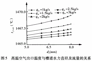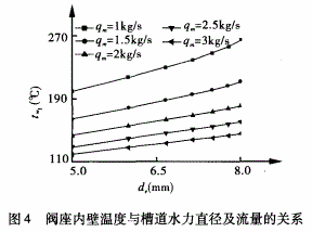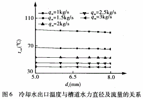 圖4、5分別表示閥座內(nèi)壁溫度和高溫空氣出口溫度隨槽道水力直徑及冷卻水流量的變化趨勢(shì)。