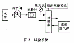 冷卻水由水源流出,經(jīng)調(diào)節(jié)閥調(diào)至合適流量后,進(jìn)入到試驗(yàn)段的閥座矩形槽中,當(dāng)高溫空氣流經(jīng)試驗(yàn)段的閥座中腔通道時(shí),則會(huì)與冷卻水進(jìn)行對(duì)流換熱。試驗(yàn)段裝有溫度測(cè)量系統(tǒng),可對(duì)冷卻水和高溫空氣進(jìn)的出口溫度及閥座壁面溫度進(jìn)行測(cè)量。